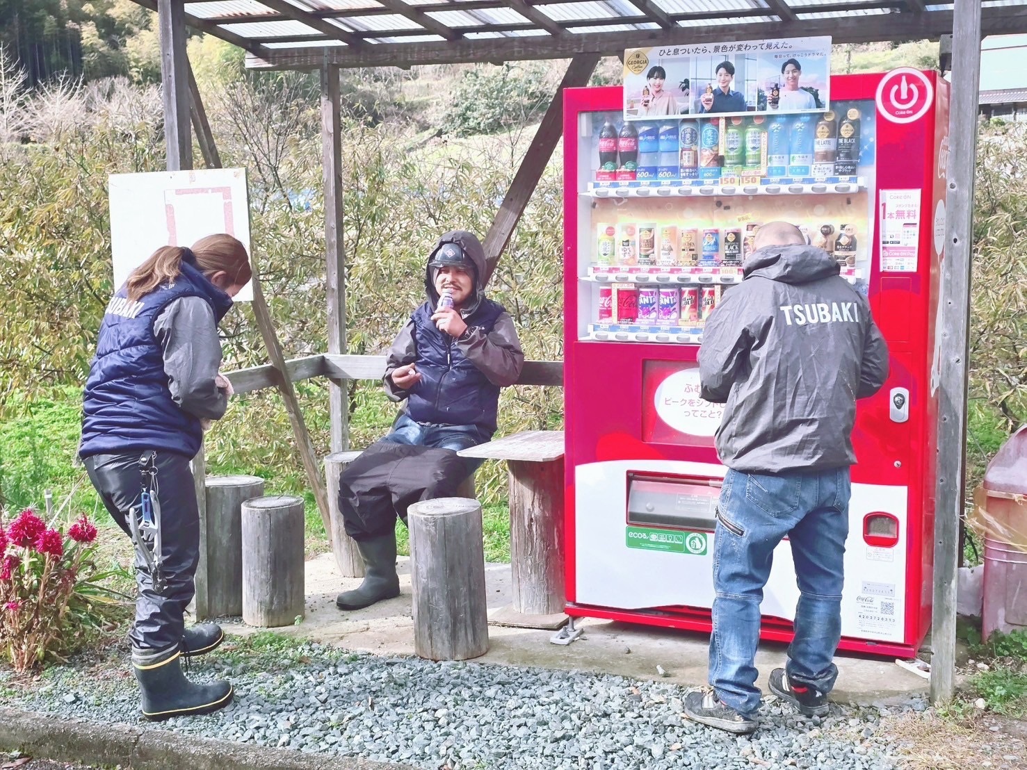 現場付近に自動販売機があって、そこで飲み物を買って休憩しているところですね!